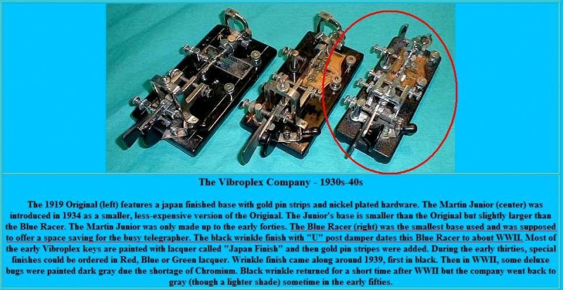 Fabrikationsdata Fra Vibroplex Collector's Site # 4 Blue Racer In most cases, the telegrapher’s employer provided a straight key for the telegrapher to use. If the telegrapher wanted to use a bug he (or she -- female telegraphers were not uncommon) had to provide his or her own bug. Many carried it back and forth to work with them, and an Original not only weighed four pounds but also took a lot of room on the operator’s desk. As a result, Martin introduced the fourth Vibroplex in 1914. It had a base that was 2.5” wide compared to the 3.5” of the Original, weighed about a pound and a half less, and had a frame which was a smaller version of that used on the Original. The damper assembly resembled the letter “U” with a damper wheel on one leg. This key was also called the “#4”, since it was the fourth Vibroplex model. Many early Blue Racers were made with a dark blue base rather than the black base used on the Original. A nickel-plated base was also an option. Any Vibroplex with a 2.5” wide base is a Blue Racer. However, the Blue Racer was also available (by special order) on the standard 3.5” base, and several have been found with a 3” base. Late in WW2, Vibroplex modernized the design with rounded castings, and the damper assembly was changed from the “U” damper to the modern “L” damper. The Blue Racer was made until the mid-Sixties. Most collectors call the early “U” damper bugs the “#4 Blue Racer” and the later “L” damper bugs the “late Blue Racer.” Around 1940, the standard base finish was changed to black crackle, and the Deluxe version became available. The #4 Blue Racer was also made in the WW2 Deluxe version. WW2 Deluxe #4 Blue Racers are very hard to find -- only ten or fifteen are in collections at the moment.
